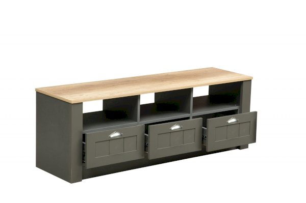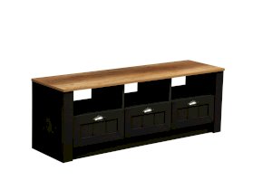 Размеры данной тумбы позволяют поставить на нее самый большой телевизор, ведь ее длина – целых 1380 мм! Тумба разделена на одинаковые три части, которые, в свою очередь, тоже зонированы. Под столешницей находятся три открытые полки-ниши, под которыми – выдвижные ящики. Каждая полка из ЛДСП выдерживает нагрузку до 5 кг. Разделение полок обеспечивает дополнительное укрепление конструкции.