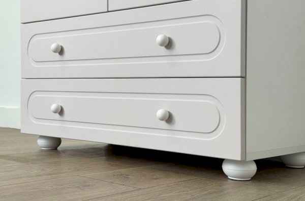 Корпус шкафа выполнен из ЛДСП толщиной 16 мм, фасады изготовлены из МДФ в плёнке ПВХ и декорированы фрезеровкой, подчёркивающей стиль серии Милана. Оригинальные круглые ручки и опоры придают шкафу аккуратный и современный вид, делая его гармоничной частью детского интерьера.