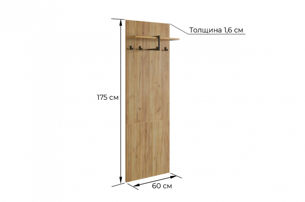 Принт, имитирующий вертикальную фрезеровку придает вешалке уникальный и современный вид, добавляя текстуру и глубину. Материал вешалки – ЛДСП, что обеспечивает прочность и долговечность, а также легкость в уходе.